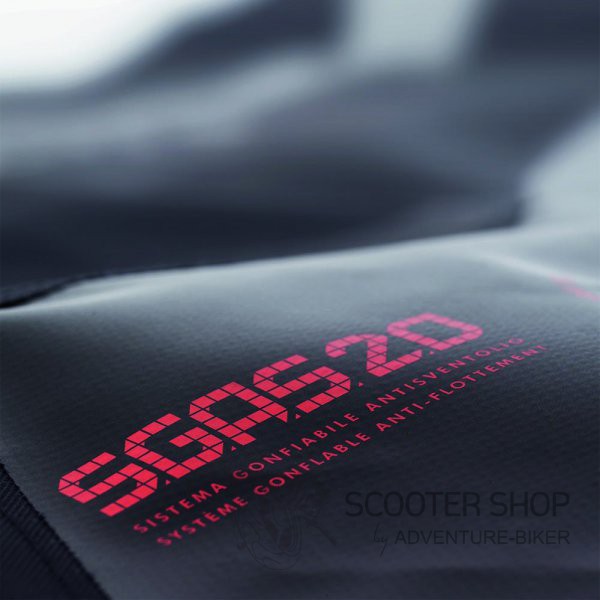 Ve výbavě dále najdeme několik kapes, patentované víčko pro startování, bezpečnostní reflexní pruhy, pojistné lanko na uzamčení a boční nafukovací ANTI-FLAP INFLATABLE SYSTEM - chraní proti vlání při vyšších rychlostech. Deka je samozřejmě vyráběna s důrazem na bezpečnost, postranice jsou koncipované tak aby se dala noha bezpečně položit na zem a uchycení okolo pasu či krku je provedeno suchým zipem s možností okamžitého vytržení.